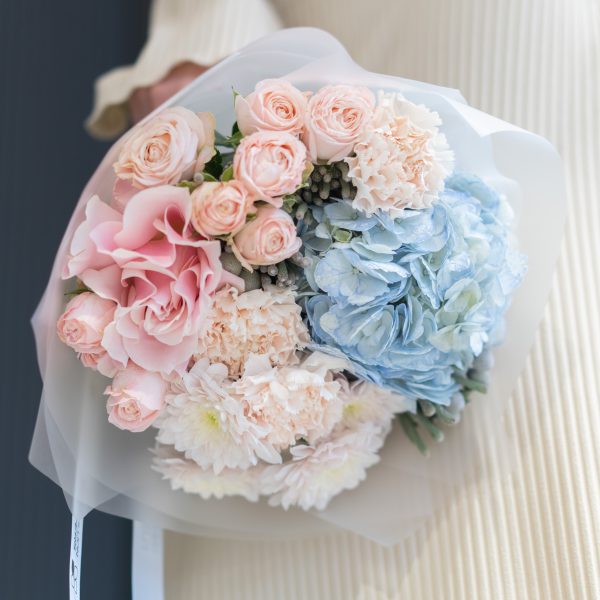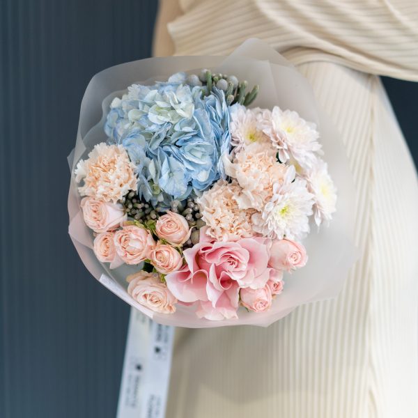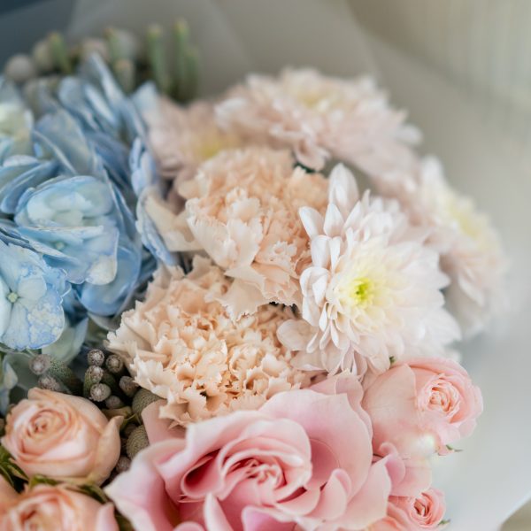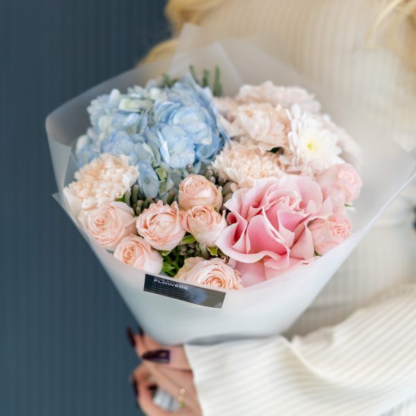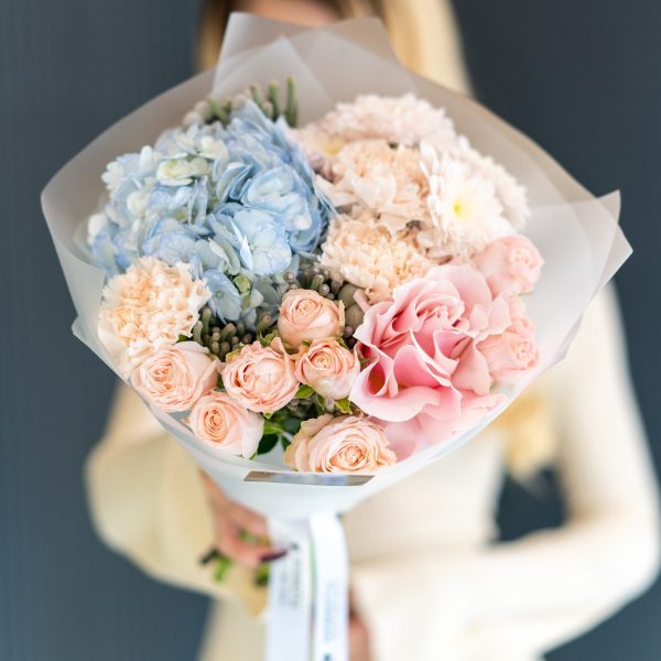 Этот великолепный букет “Бруни Блу” Mate станет настоящим сокровищем для любителей нежных и ярких цветовых сочетаний. Он включает в себя роскошные оттенки розового диантуса и кустовой розы Бомбастик, которые прекрасно гармонируют с благородными голубыми цветами гортензии. Дополняя композицию, кустовая розовая хризантема и шарики брунии придают букету свежесть и шикарную текстуру. Такой букет отлично подойдет для любого случая, от поздравления до романтического жеста.