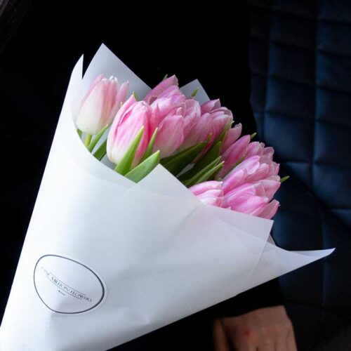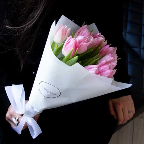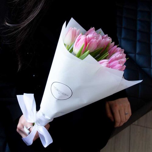 Букет из нежно розовых тюльпанов Династия в сочетании с яркой и сочной зеленью – настоящая весенняя композиция.