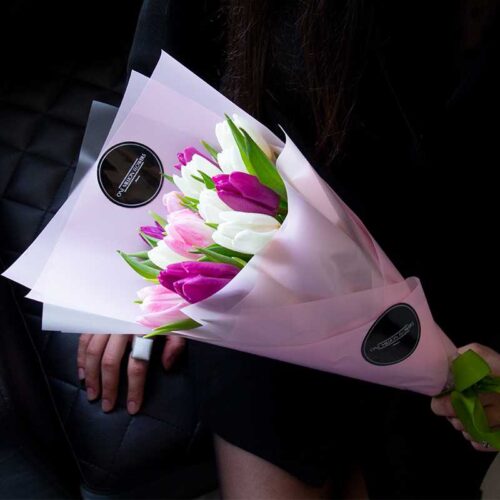 Микс из тюльпанов в сочетании с яркой и сочной зеленью – настоящая весенняя композиция.