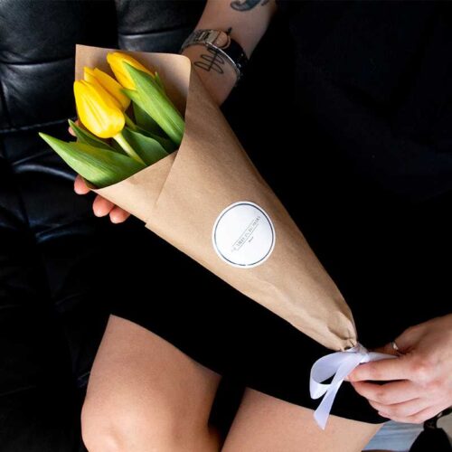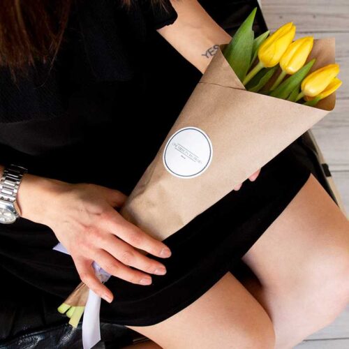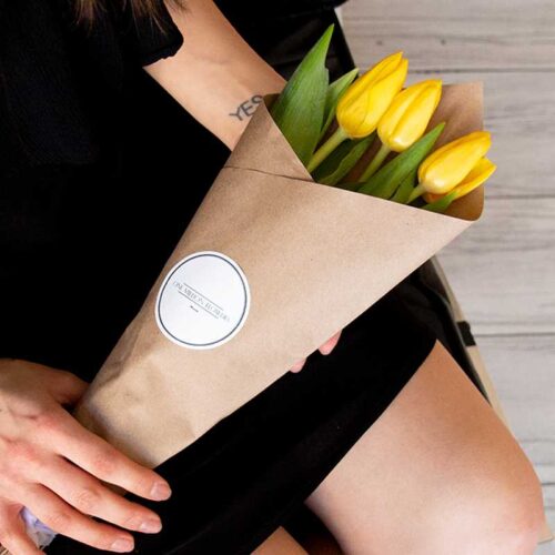 Ярко желтые тюльпаны Еллоу Голд в сочетании с яркой и сочной зеленью – настоящая весенняя композиция.