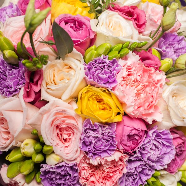 Свежая и яркая композиция из желтых и розовых пионовидных роз в сочетании с фрезией и фисташкой.