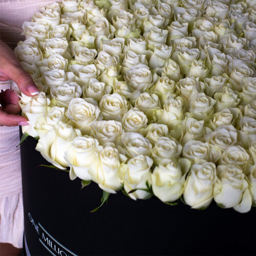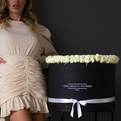 Представляем Вам нежные белые розы Аваланш в роскошной коробке коллекции BLACK с атласной красной лентой в тон цветам.