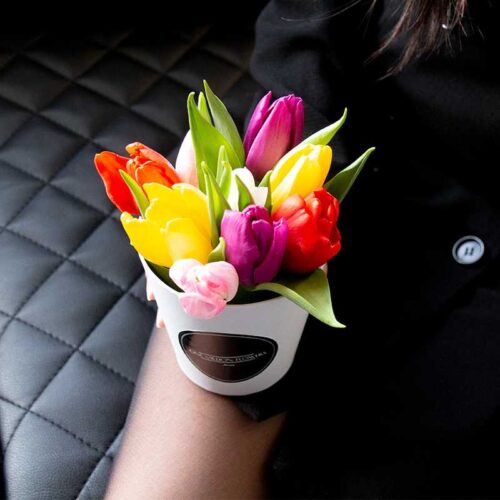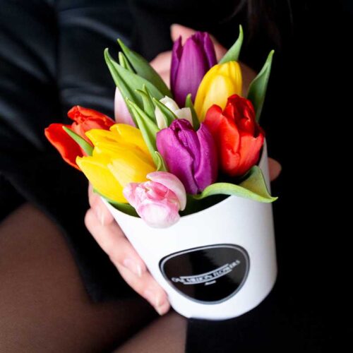 Яркий микс тюльпанов, в нашей коробки White, это настоящий изысканный весенний подарок.