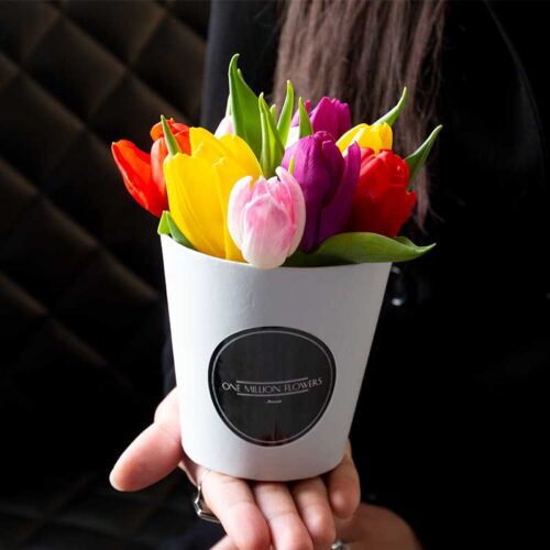 Коробка собрана с 11 свежими разноцветными весенними тюльпанами.