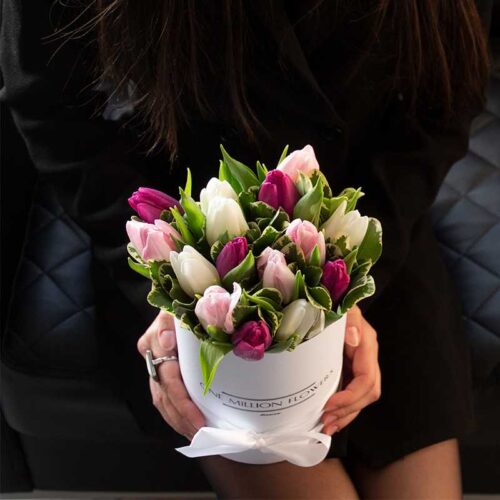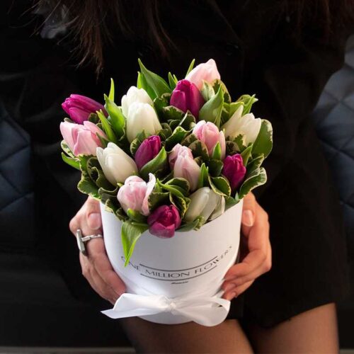 Яркий микс из белоснежных, нежно розовых и фиолетовых тюльпанов, с нежнейшим двуцветным Питуспорумом в нашей коробки White, это настоящий изысканный весенний подарок.